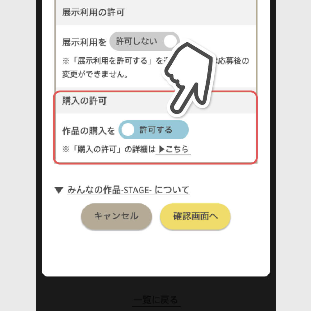 ①あなたの作品の作品詳細ページから「作品公開設定」よりみんなの作品 -STAGE-作品応募フォーム「購入を許可する」にチェックを入れると「購入可能申請」状態になります。